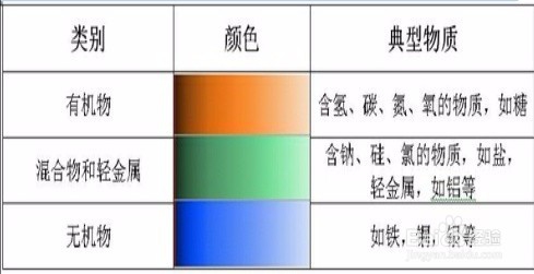 在顏色模式下、有機物顯示為不同的橙色和黃色、無機物顯示深淺不同的綠色、高密度物品顯示為黑色和深紅色。